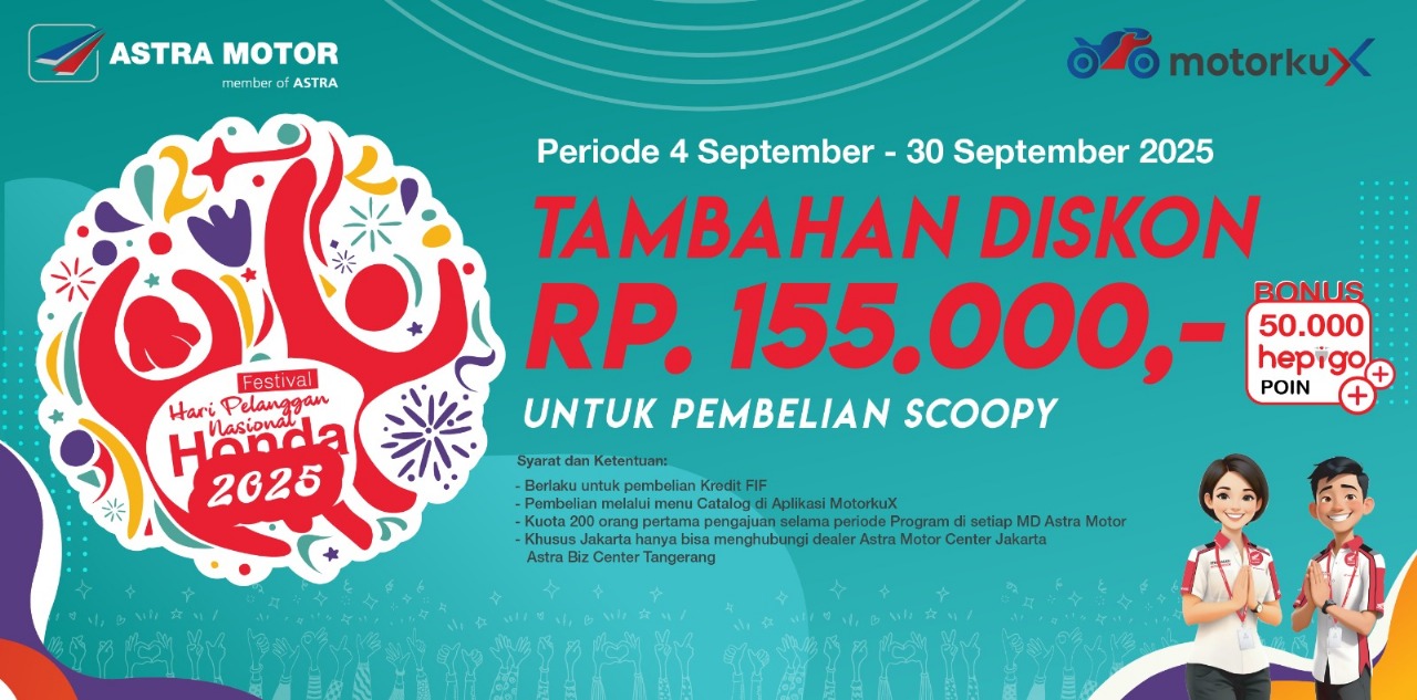 Melalui promo ini, Astra Motor Papua menawarkan voucher diskon tambahan senilai Rp155.000 untuk setiap pembelian Honda Scoopy dengan metode pembayaran kredit melalui FIF. Tidak hanya itu, konsumen juga akan mendapatkan bonus 50.000 Hepigo Poin yang dapat digunakan untuk beragam keuntungan tambahan, mulai dari diskon layanan hingga penawaran eksklusif lainnya.
