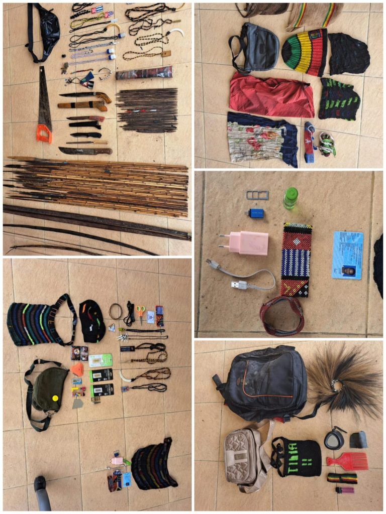 Dari penggerebekan di enam lokasi, aparat mengamankan barang bukti berupa parang, tombak, panah, bendera berlambang tertentu, serta telepon genggam. Senjata api belum ditemukan.