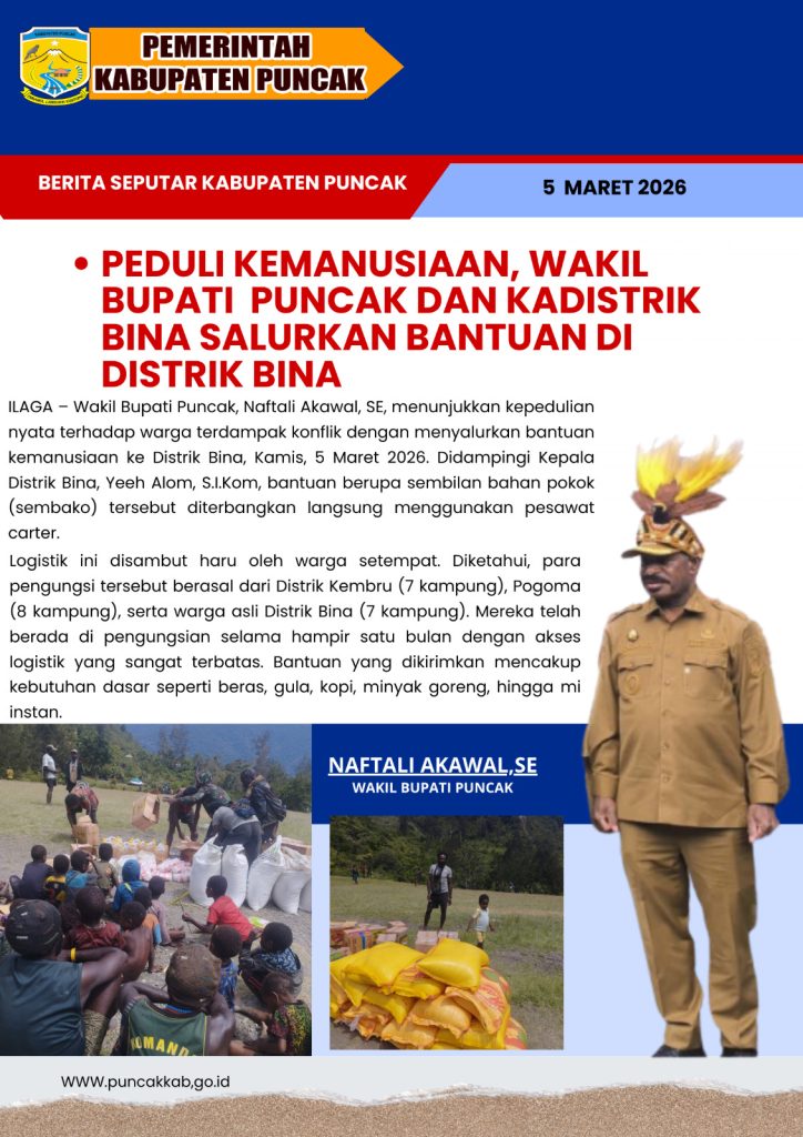 PUNCAK, HarianTerbaruPapua.com – Wakil Bupati Puncak, Naftali Akawal, menunjukkan kepedulian nyata terhadap warga terdampak konflik dengan menyalurkan bantuan kemanusiaan ke Distrik Bina, Kamis (5/3/2026). Didampingi Kepala Distrik Bina, Yeeh Alom, bantuan berupa sembilan bahan pokok (sembako) tersebut diterbangkan langsung menggunakan pesawat carter.